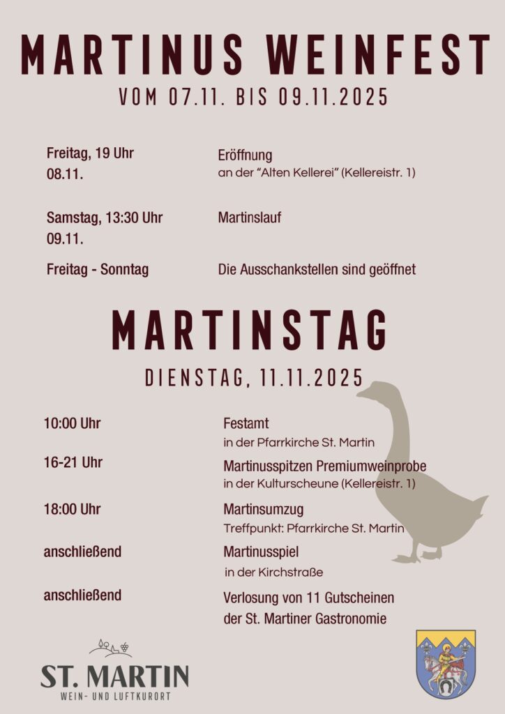 Die Ortsgemeinde St. Martin feiert jedes Jahr am 11. November seinen Namenspatronen – den Hl. Martin von Tours – mit mehreren Festlichkeiten. Die Winzer des Weinbauvereins beteiligen sich auf vielfältige Art und Weise an den Festlichkeiten in der Woche um den 11.11. Zu den Festlichkeiten der Orts- und Kirchengemeinde zählen das Martinusfest, das Martinusspiel der Laienspielgruppe St. Martin, der Martinsumzug, der Martinslauf und vieles mehr…